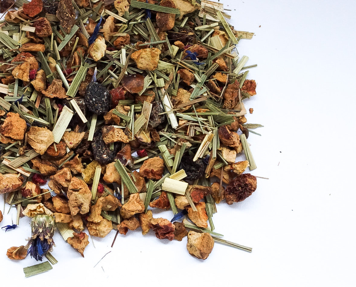 Apfel*, Lemongras*, Weinbeere (Weinbeere, pflanzl. Öl)*, Dattel (Dattel, Reismehl)*, natürliches Zitronen Aroma, natürliches Himbeeren Aroma, natürliches Grapefruit Aroma, natürliches Bergamotte Aroma, Himbeere*(2%), Zitronenschalen*, Kornblumen blau*, Acerola*(1%).