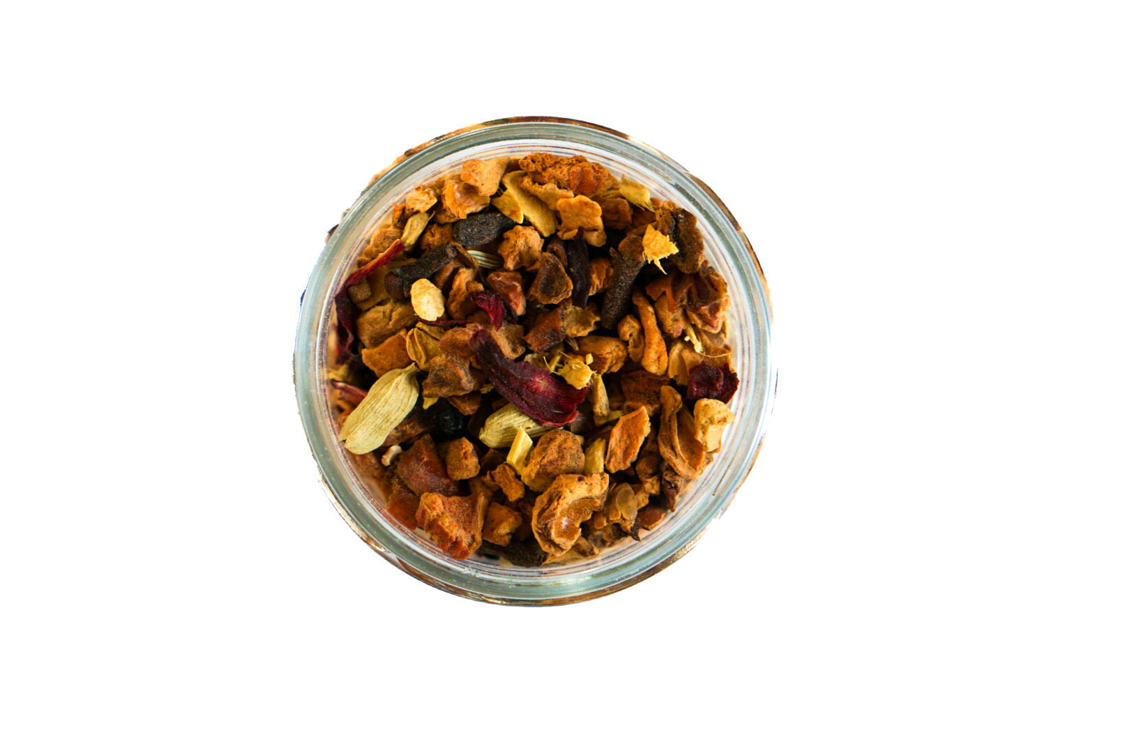 Zutaten: Apfel*, Ingwer*, Zimtstangen*, Fenchel*, Holunderbeere*, Hibiscus*, Anis*, Kardamom*, Nelke*, Süßholzwurzel*, Kurkuma*, Kardamom gemahlen*.