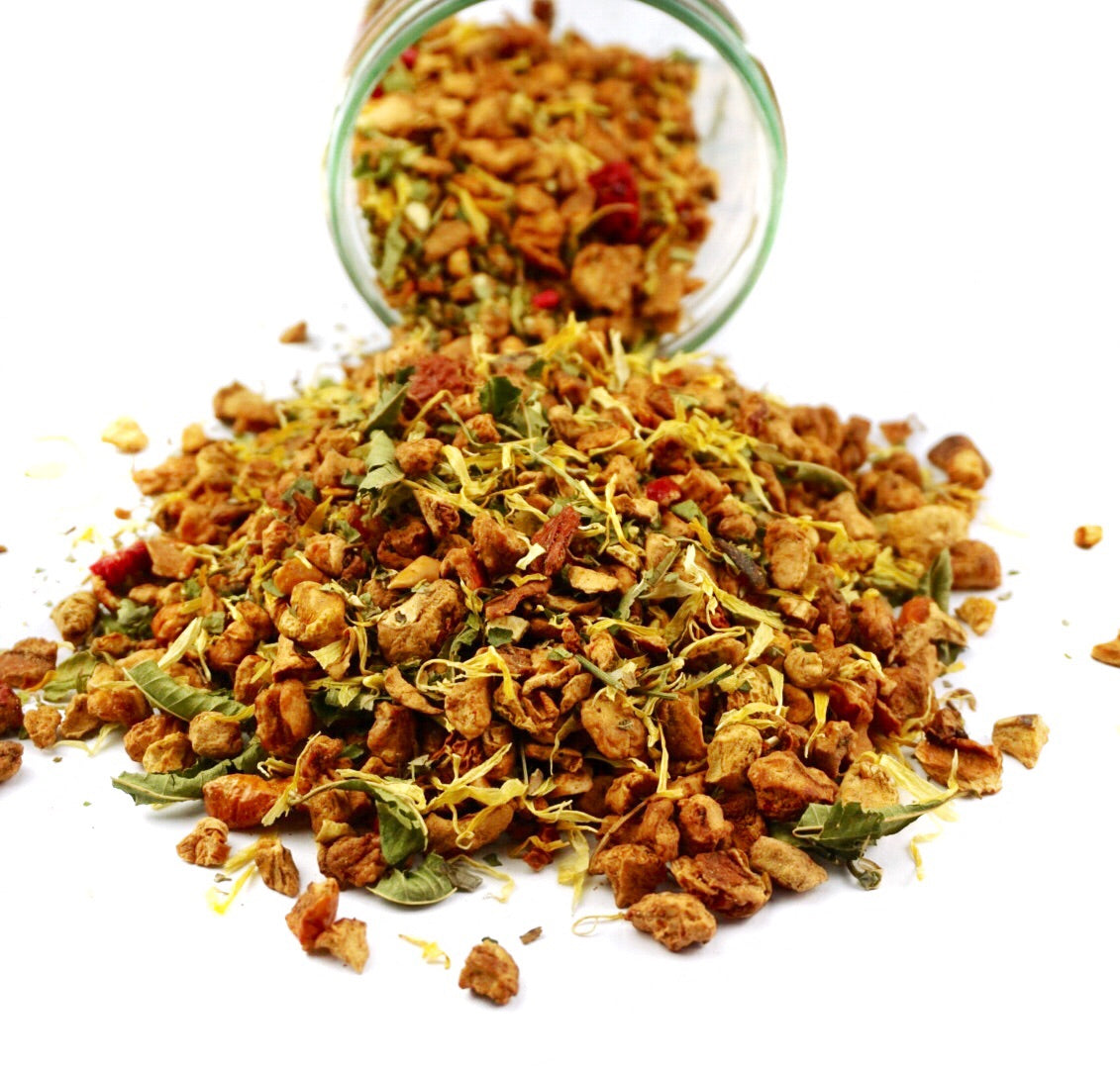 Apfel*, natürliches Erdbeer Aroma, natürliches Zitronen Aroma, natürliches schw. Johannisbeeren Aroma, Grüner Rooibos*, Verbene*, Orangenschalen*, Ringelblumen*, Verbene ganz*, Brombeerblätter*, Himbeeren*, Passionsblumenkraut*, schwarze Johannisbeere*.