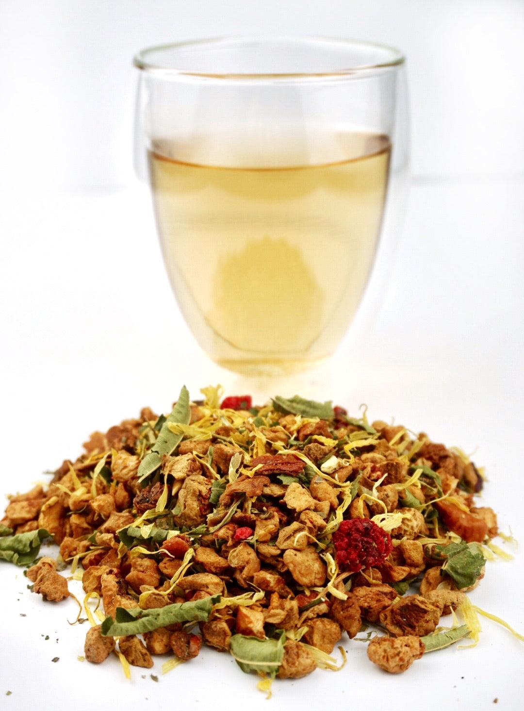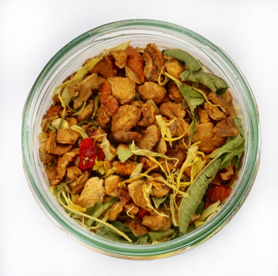 Apfel*, natürliches Erdbeer Aroma, natürliches Zitronen Aroma, natürliches schw. Johannisbeeren Aroma, Grüner Rooibos*, Verbene*, Orangenschalen*, Ringelblumen*, Verbene ganz*, Brombeerblätter*, Himbeeren*, Passionsblumenkraut*, schwarze Johannisbeere*.