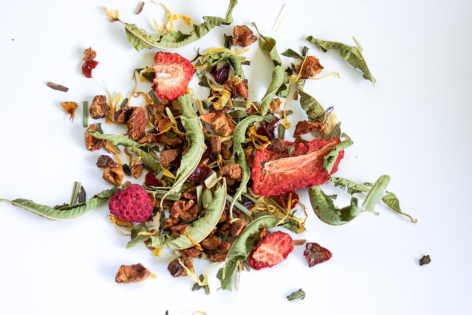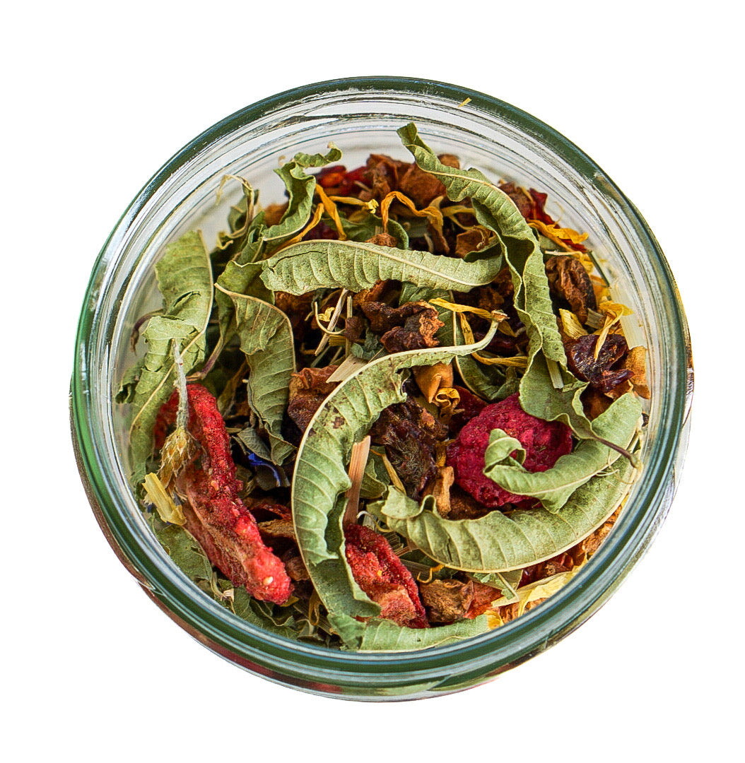 Apfel*, Hagebutte*, Lemongras*, Pfefferminze*, natürliches Erdbeeraroma, Ringelblumen*, Verbene ganz*, Erdbeere*, Lindenblüten*, Aroniabeere*, natürliches Himbeeraroma, Himbeere*, Kornblumen blau*
