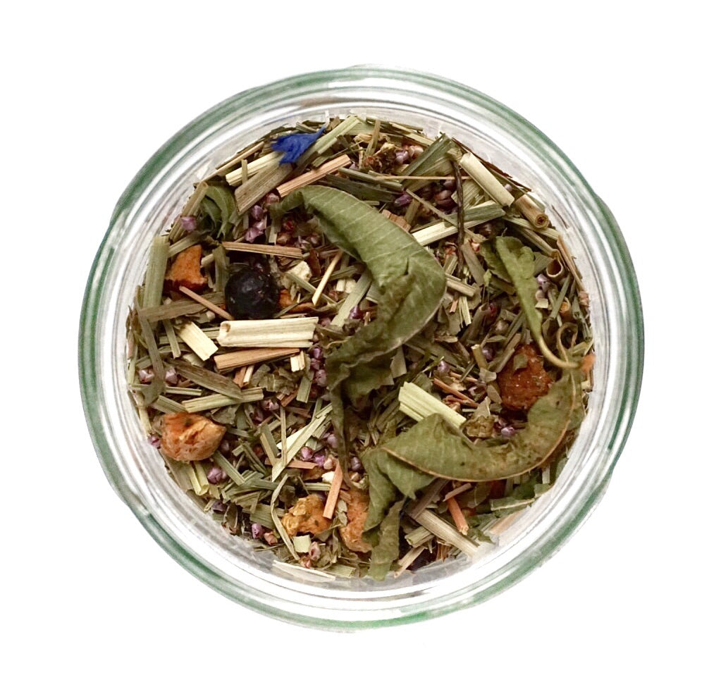 Lemongras*, Erikablüten*, Apfel*, Brombeerblätter*, Zitronenschalen* (9%), Hibiskus*, natürliches schw. Johannisbeere Aroma, natürliches Zitronen Aroma, Verbene ganz*, Wildheidelbeere*, rote Johannisbeere* (2%), schwarze Johannisbeere* (2%), Acai*, Kornblume blau*.