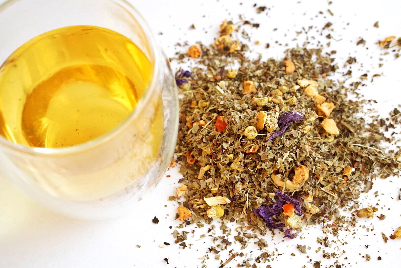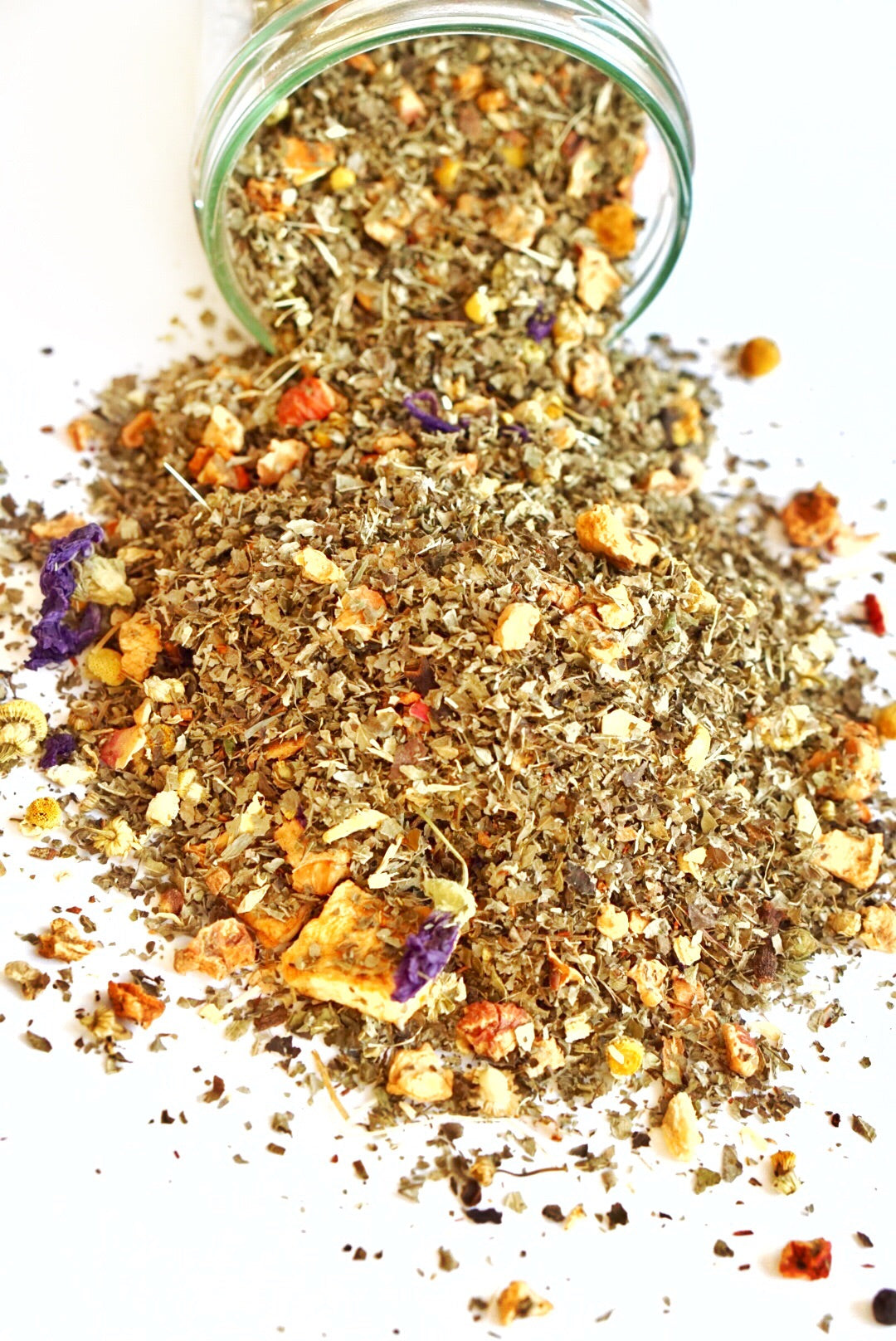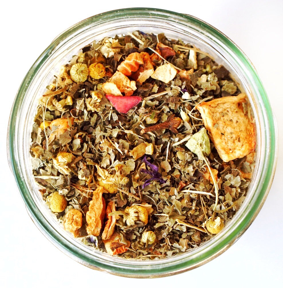 Apfel*, Brombeerblätter*, Ingwer*, Zimtstangen*, Rooibos Natur*, Kamille*, Pfeffer schwarz*, Orangenschalen*, Apfelecken*, Nelke*, Kardamom*, Malve*.