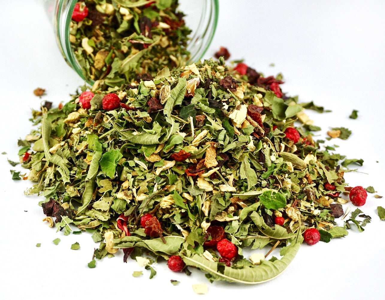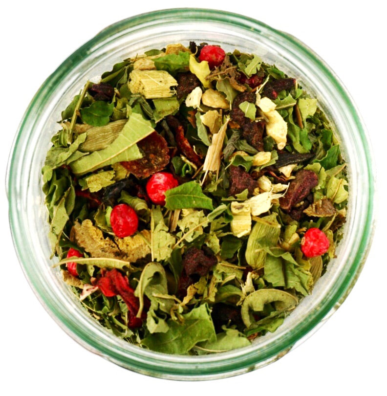 Ingwer*, Verbene*, Rote Beete*, Hagebutte*, Moringablätter*, Melisse*, Quitte*, Süßholzwurzel*, Fenchel*, Verbene ganz*, Hibiskus*, Johanniskraut*, rote Johannisbeere*, Pfeffer rosa*, Kardamon*, Granatapfel*.