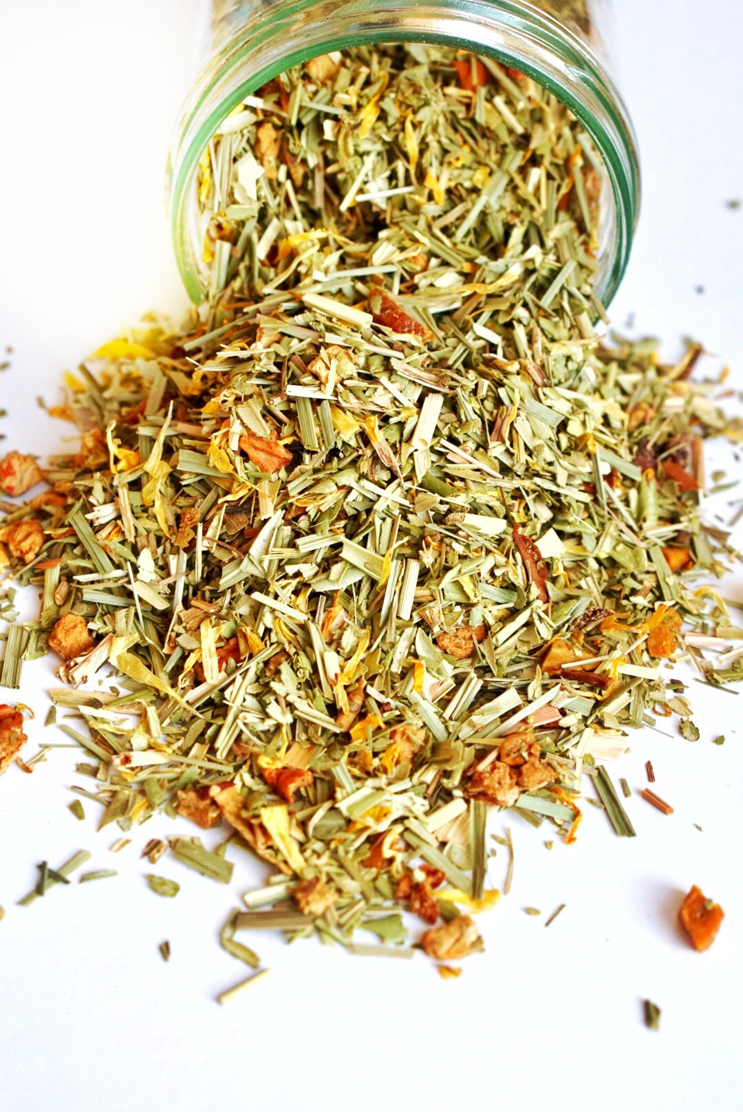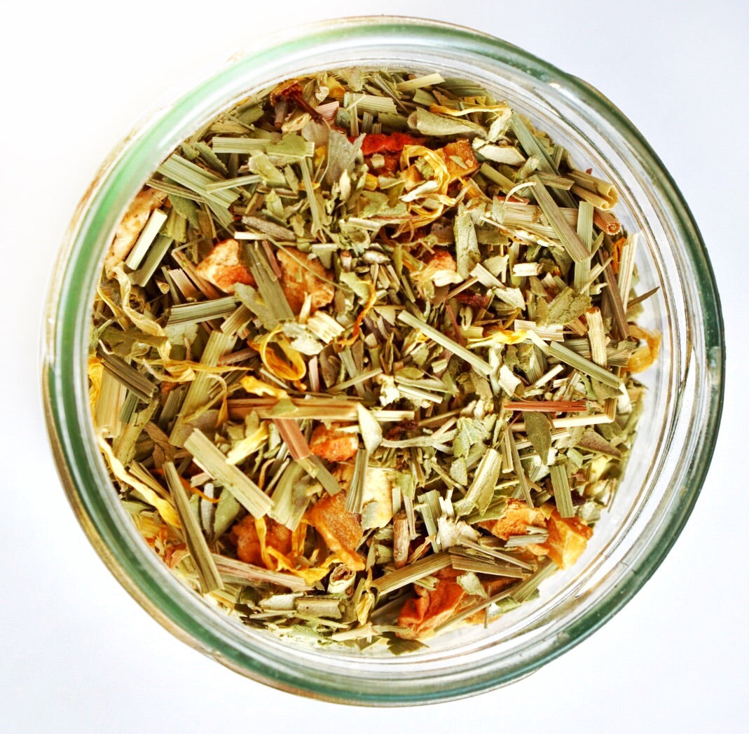 Olivenblätter*, Lemongras*, Apfel*, Mangostücke*, Papaya*, natürliches Pfirsich Aroma, natürliches Maracuja Aroma, Passionsblumenkraut* (4%), Ringelblumen*.