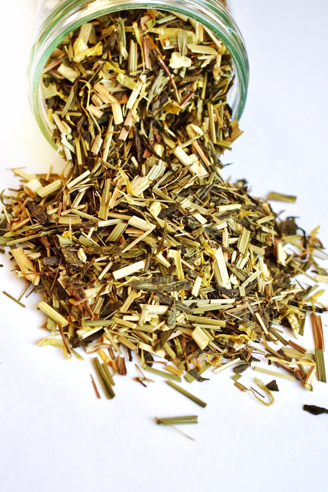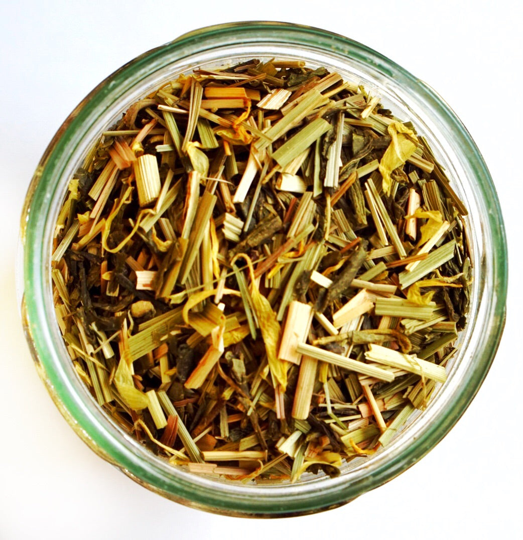 Grüner Tee China Sencha*, Lemongras*, Ingwer*, natürliches Zitronen Aroma, Zitronenschalen*, Ringelblumen*.